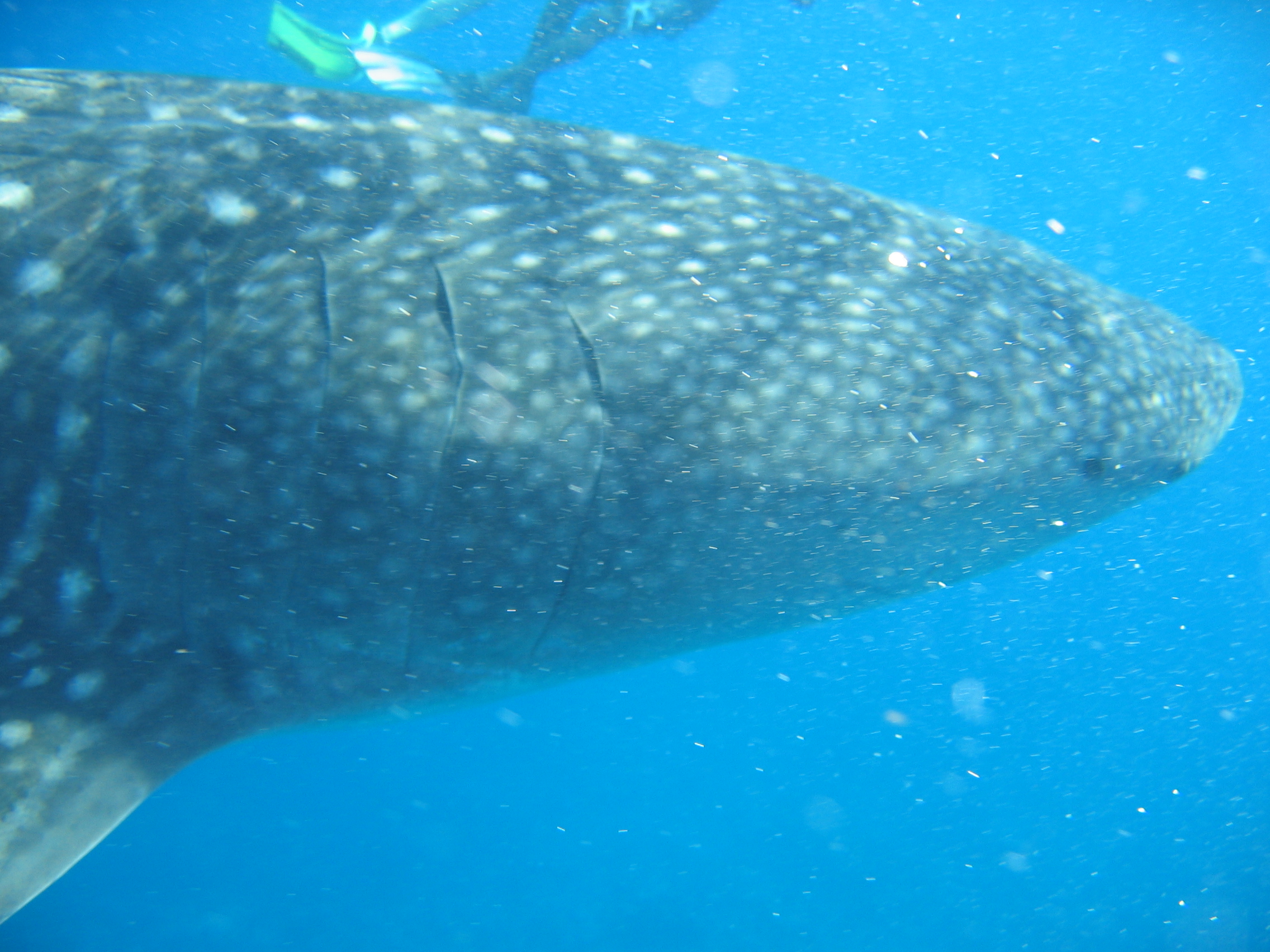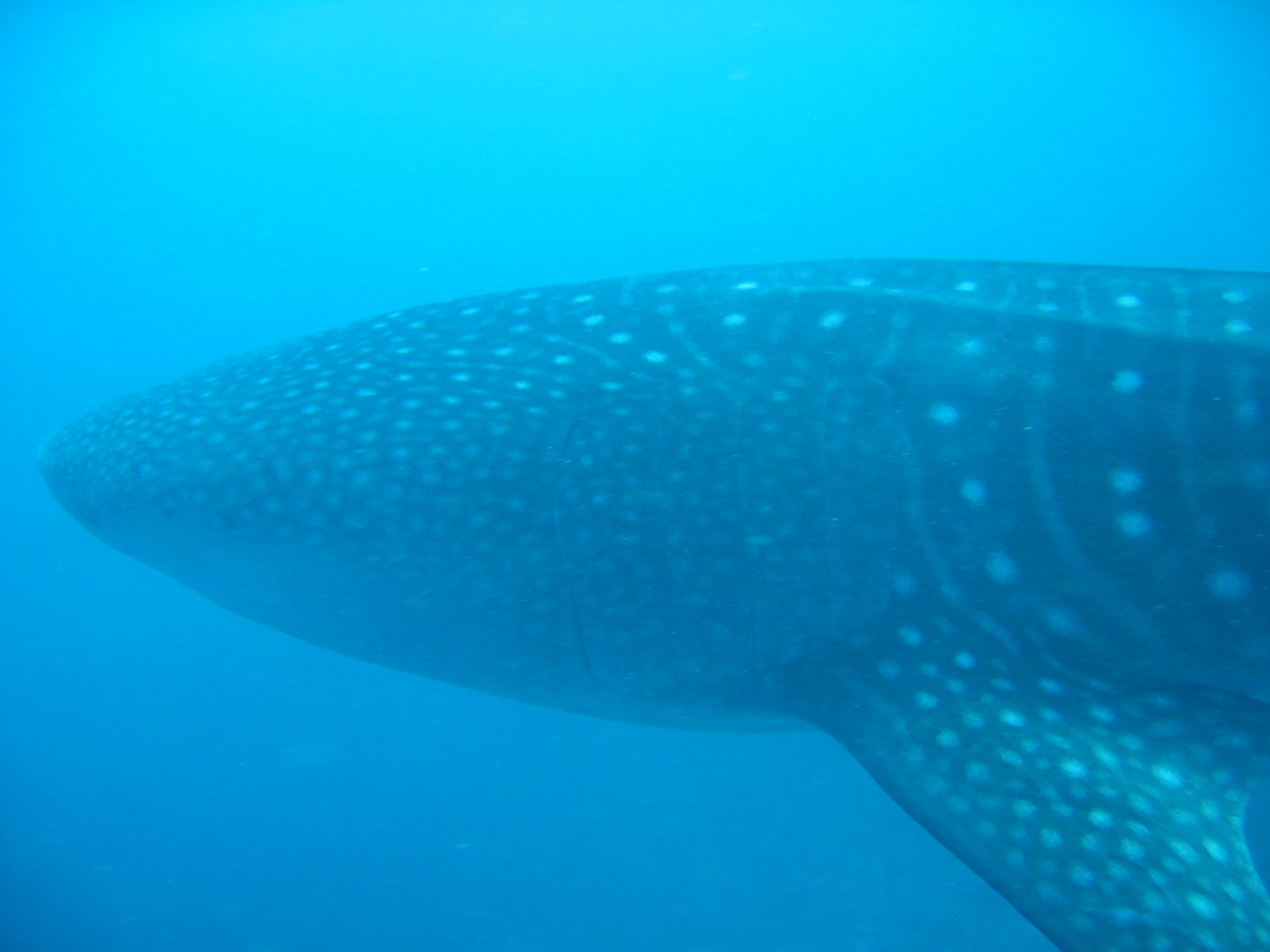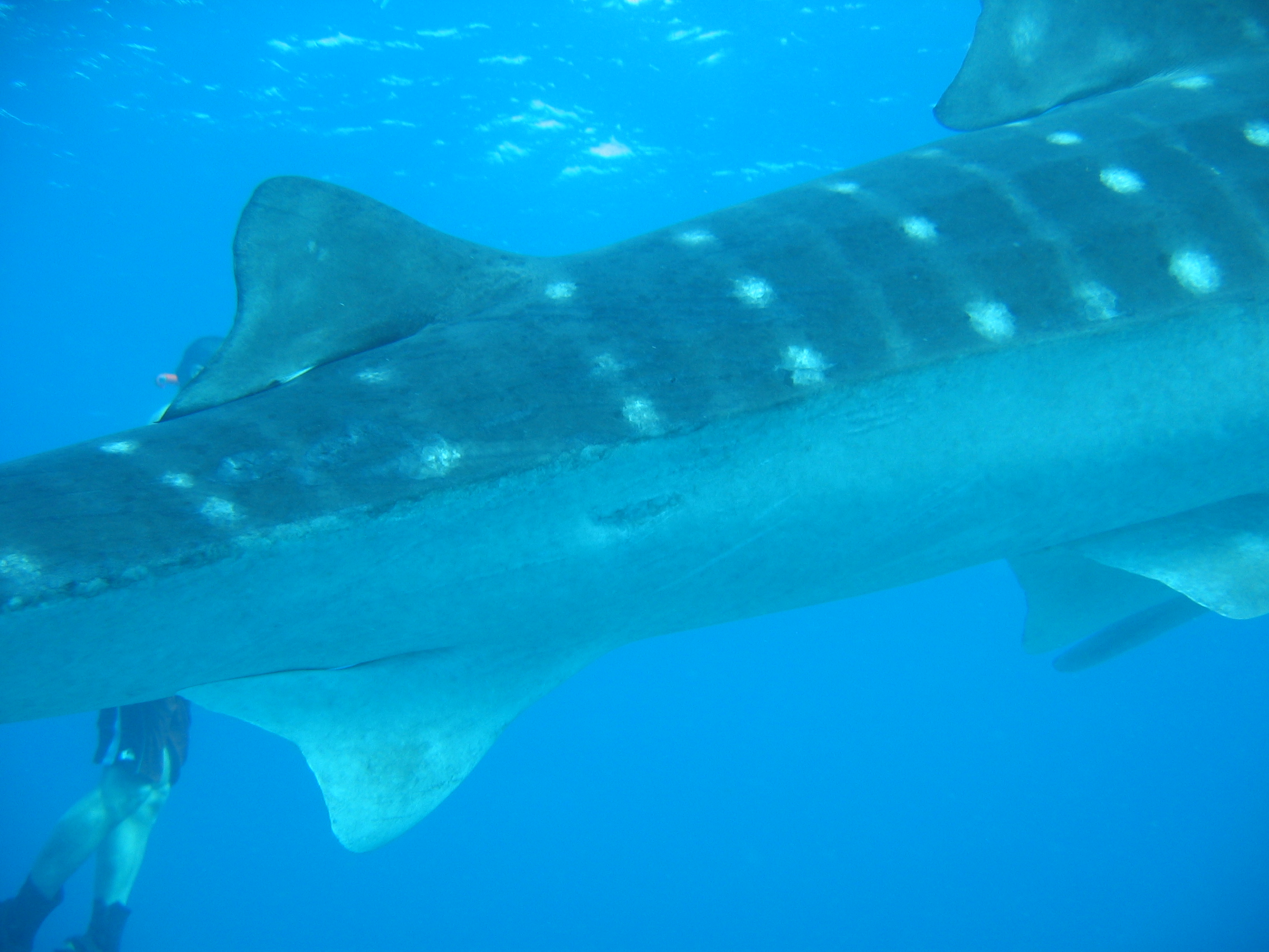 Right side of body, from just ahead of dorsal to near peduncle heavily scarred, a fist sized hole on underside just ahead of 2nd dorsal (M09).
