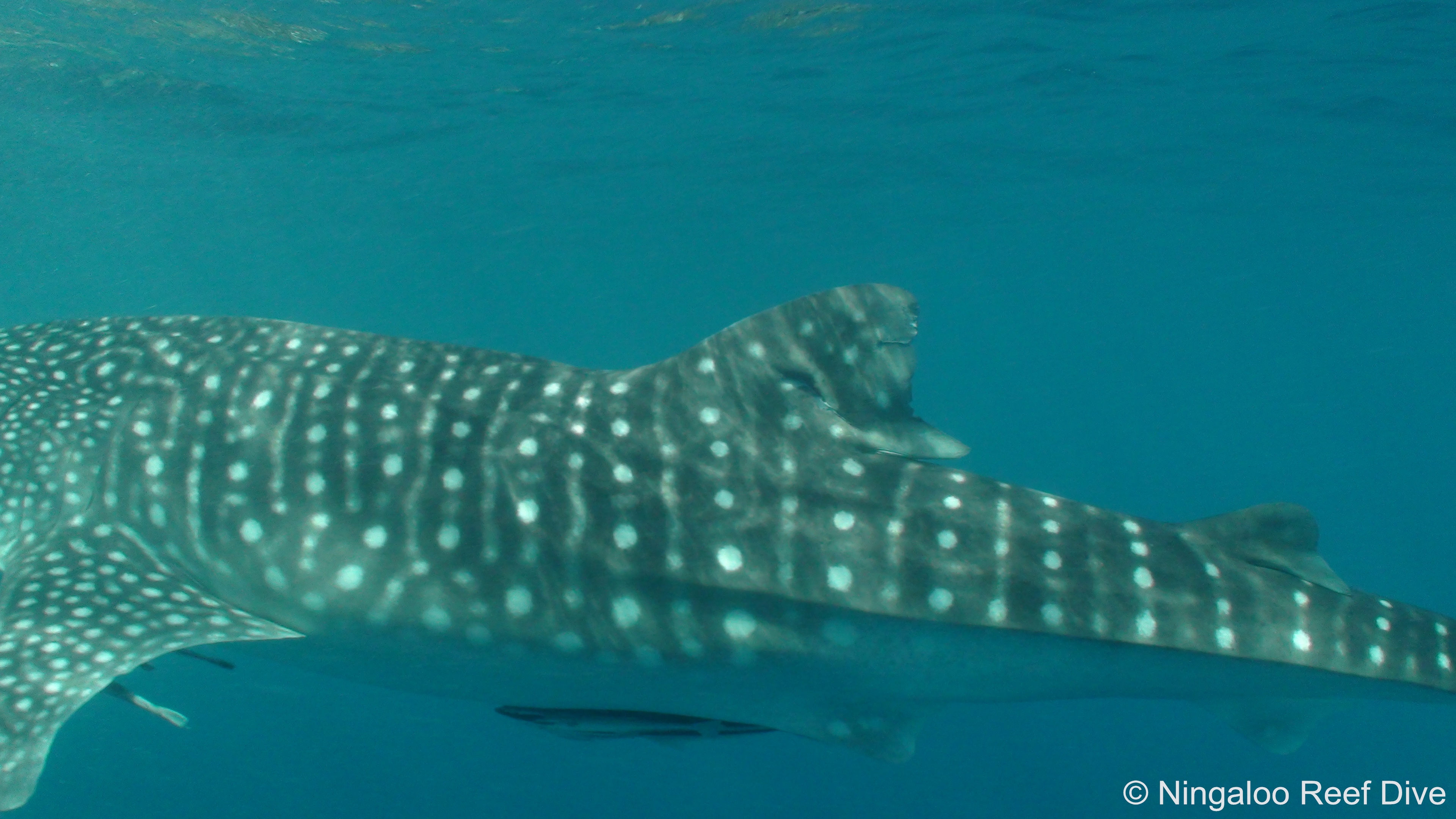 Noticeable scarring: puncture wound in middle of dorsal fin; significant tear in middle of trailind edge of dorsal, jagged trailing edge also.