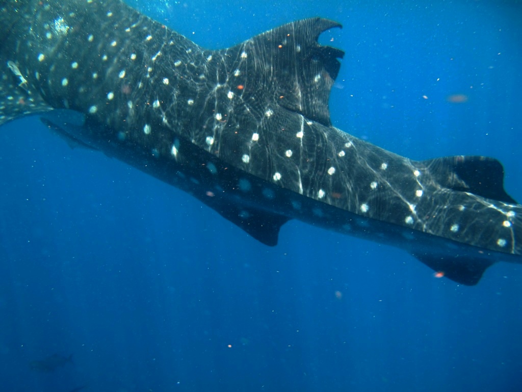 Noticeable scarring: Round missing shark bite-like on rear end of first dorsal